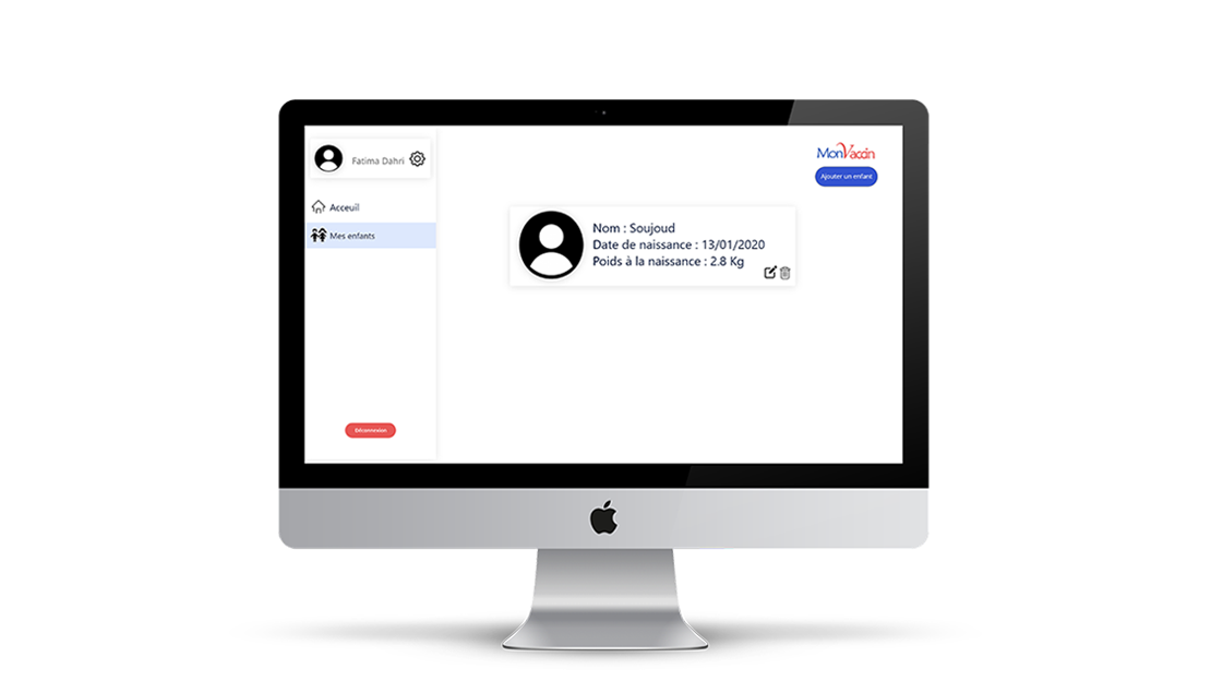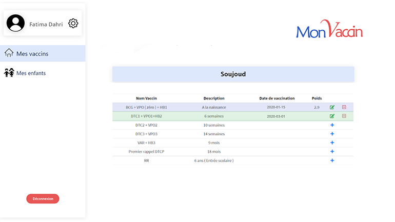 The Mon Vaccin application facilitates the vaccination follow-up of children by displaying the list of vaccines scheduled in the national vaccination calendar. The user can enter the next appointment, the weight of his child and displays all this information in the page intended for each child as well as a dashboard which displays the notifications.